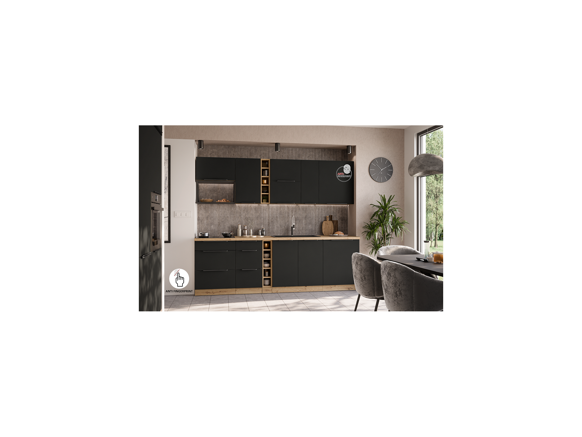 Sõrmejäljekindel kate on uuenduslik lahendus, mida kasutatakse premium-klassi mööblis. See kaitseb pinda puudutusjälgede eest, jäädes samal ajal meeldivaks puudutusele, mati ja elegantseks. Selline viimistlus sobib ideaalselt nii moodsate ja minimalistlike sisustuslahendustega kui ka Skandinaavia, loft- ja klassikalistesse köökidesse.