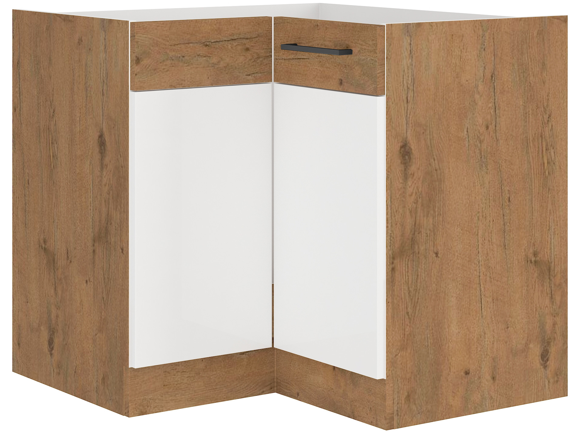 – 16 mm MDF-plaat, valge läikiv / tamme laminaatplaat Lancelot – 1 mm ABS-serv – käepide: must metall – Korpus: – 16 mm Lancelot Tamme laminaatplaat – kappide sisemus valge – h6>